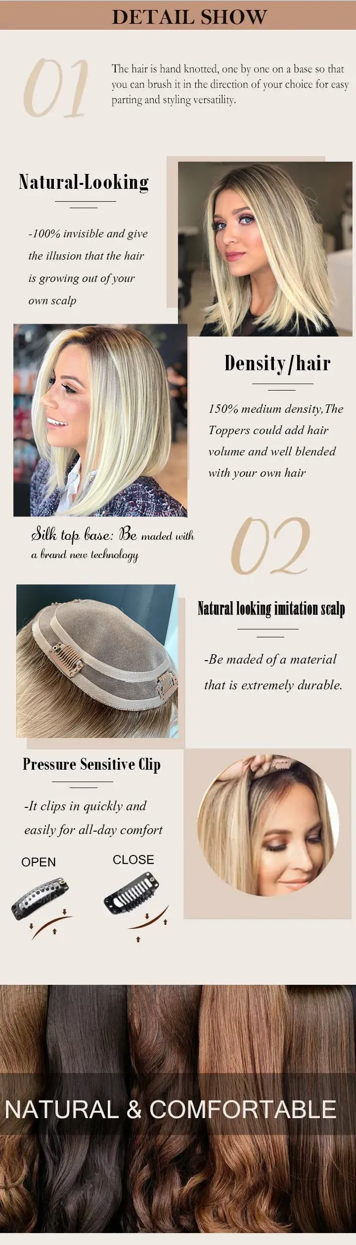 The ideal solution for women suffering from bald patches, thinning hair, hair loss or alopecia. Our hair toppers are custom made with 100% real human hair and gives you a naturally fuller scalp, instantly.